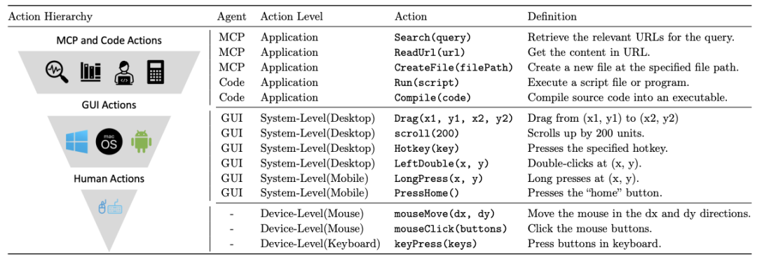 在MCP或Code层,它们可以直接调用Search(query)完成搜索,无需打开界面或点击按钮。 在GUI层则执行封装好的系统动作,如“双击”或“按下热键”。