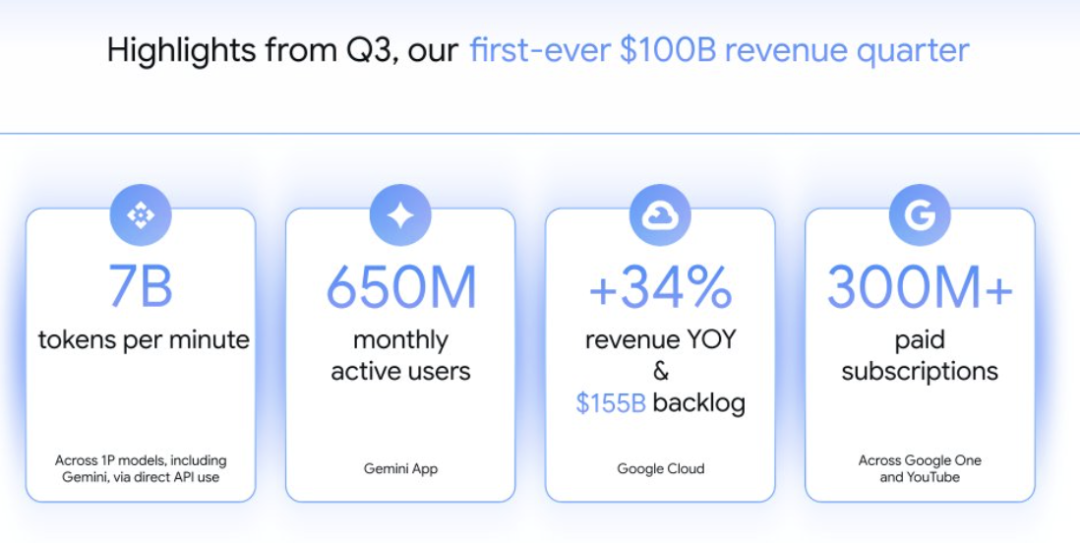 AI业务带动之下,谷歌季度营收也首次突破千亿美元,交出了有史以来最亮眼的成绩单。