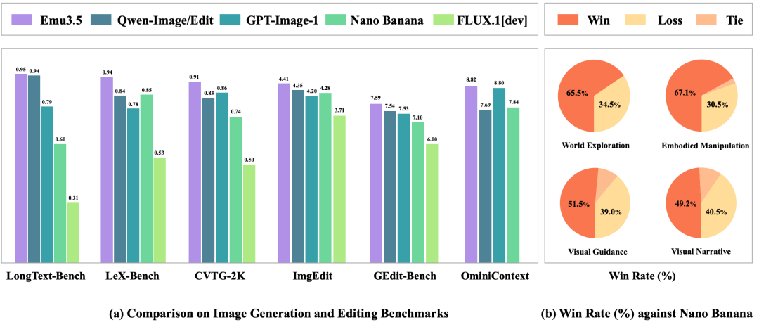 在多个权威基准测试中,Emu3.5 的表现超越了众多业界领先的模型。