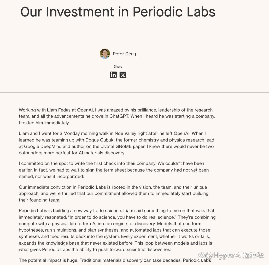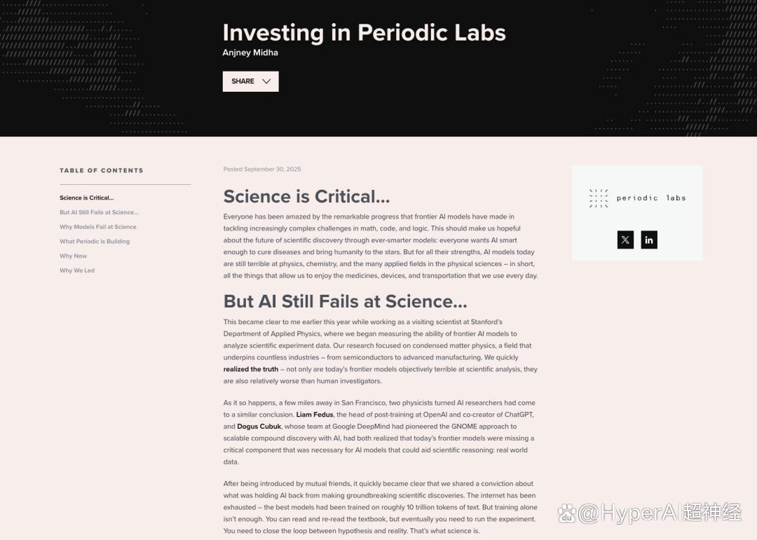 Periodic Labs 自称正在构建「AI 驱动的科学平台」,其愿景是让人工智能不仅能分析数据,还能设计实验、驱动物理仪器、发现新材料。