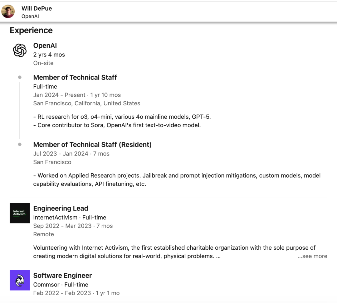 在OpenAI,Will Depue参与都是最核心的项目:o3/4o的后训练,sora 1 & 2的研发以及应用研究。