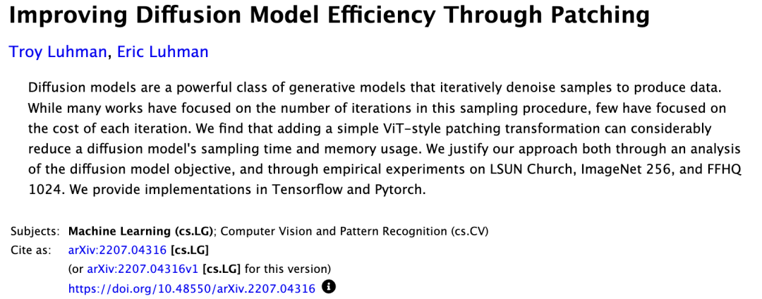 下面这篇提出将「ViT-style patching」(即将图像分块为patches)技术应用于扩散模型,以减少每个采样步骤的计算量/内存消耗。