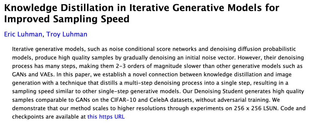 比如下面这篇研究如何将「多步扩散/去噪」生成模型通过知识蒸馏(knowledge distillation)转换为一步或更少步数的采样模型,从而大幅提升生成速度。