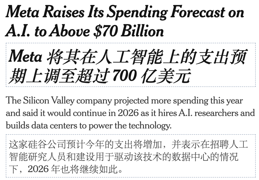 2025年Meta在AI方面的相关支出超过700亿美元,年底这个数字可能增加到720亿美元,2026年这一数字将超过1000亿美元。