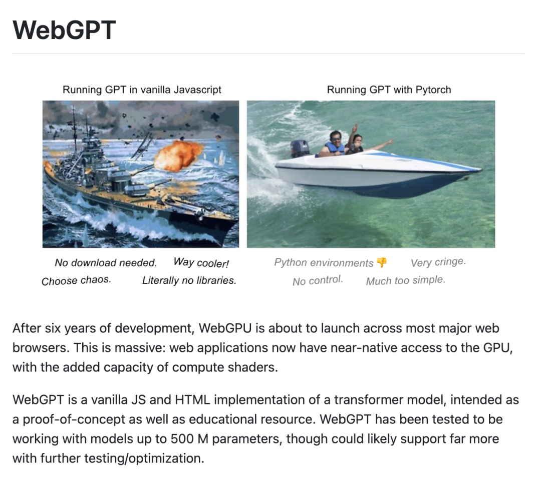 一个基于浏览器的GPT实现,WebGPT,Github上有3700个Stars。这个项目的初衷是,WebGPU即将在大多数主流浏览器上推出。