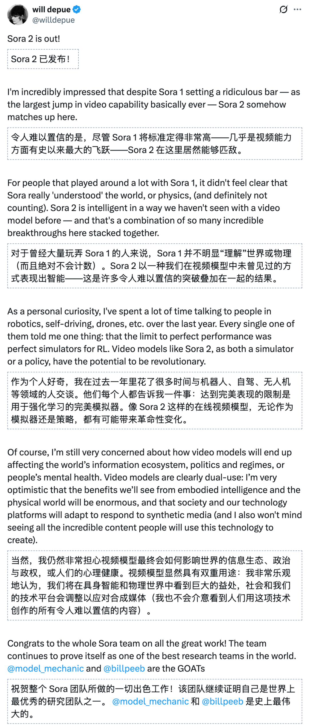 对于Sora 2的发布,Will DePue给予了很高的评价。