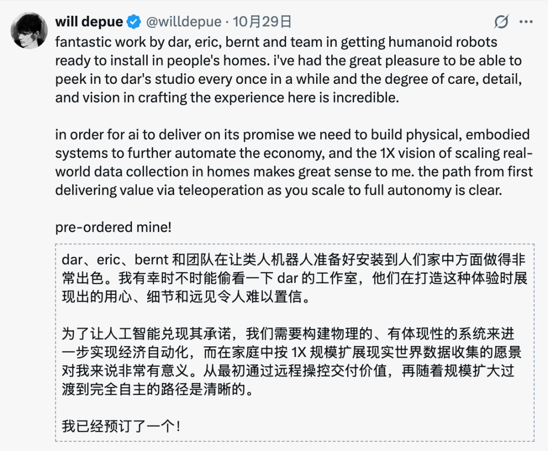 Will DePue也转发Neo的帖子,并声称已经订购。