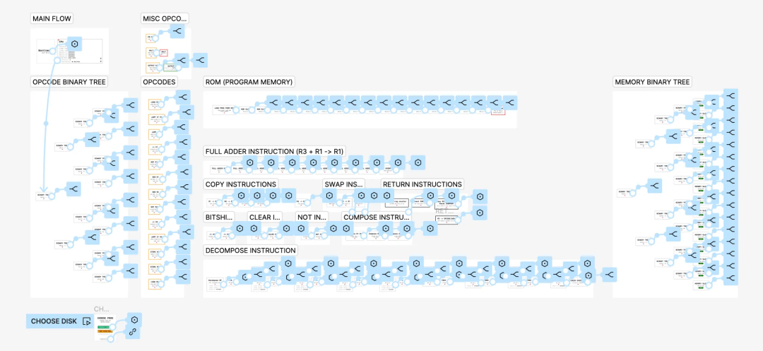 首台完全在Figma中构建的图灵完备机,8位架构,512位RAM,16字节程序内存,包含16条操作码的MISC指令集,10赫兹的时钟速度,4个快速访问寄存器,二叉树结构的RAM/ROM存储。