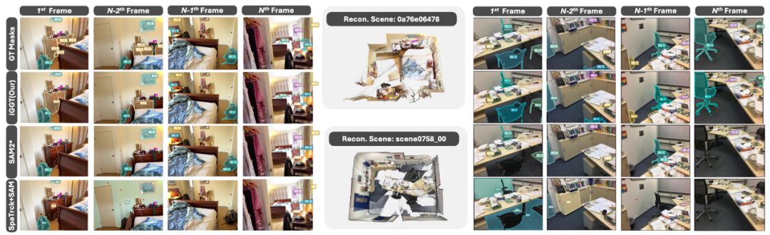 在实例3D跟踪任务上,IGGT的跟踪IOU和成功率高达70%和90%,是唯一一个能够成功跟踪物体消失又重新出现的模型。