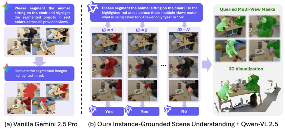 此外,团队还可以利用实例掩码(instance masks)构建视觉提示(visual prompts),并将其接入如 Qwen-VL 等大型多模态模型(LMM),以实现更复杂的针对场景中特定物体的查询与问答任务。相反,即便是当前最先进的 LMM 模型,在处理多视图或三维场景理解方面仍存在显著的局限。