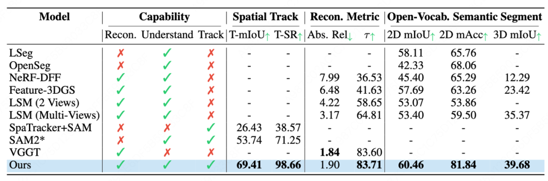 相比于已有的方法,IGGT是唯一一个能够同时做到重建、理解和跟踪三个任务的模型,并在理解和跟踪指标上大幅提升。
