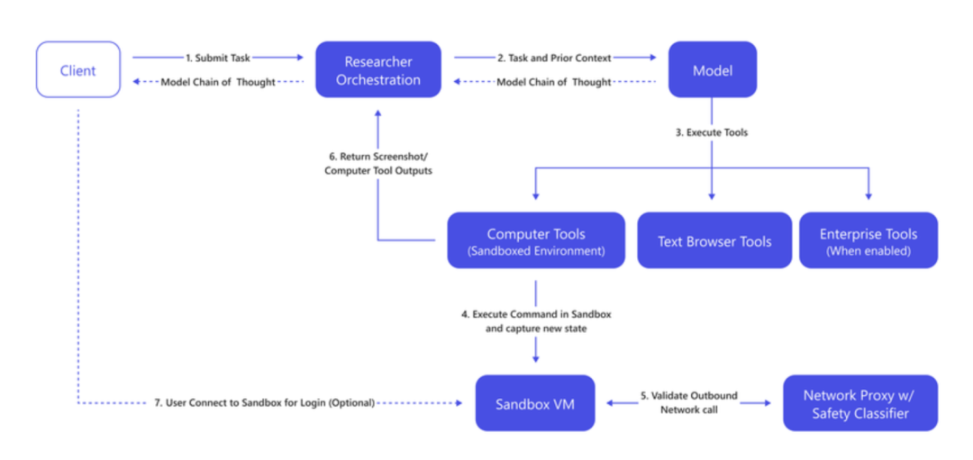 沙盒环境中配备虚拟浏览器、终端和文本浏览器,浏览器和终端界面的输出截图会返回给模型,文本浏览器可以加速纯文本内容的推理和搜索。