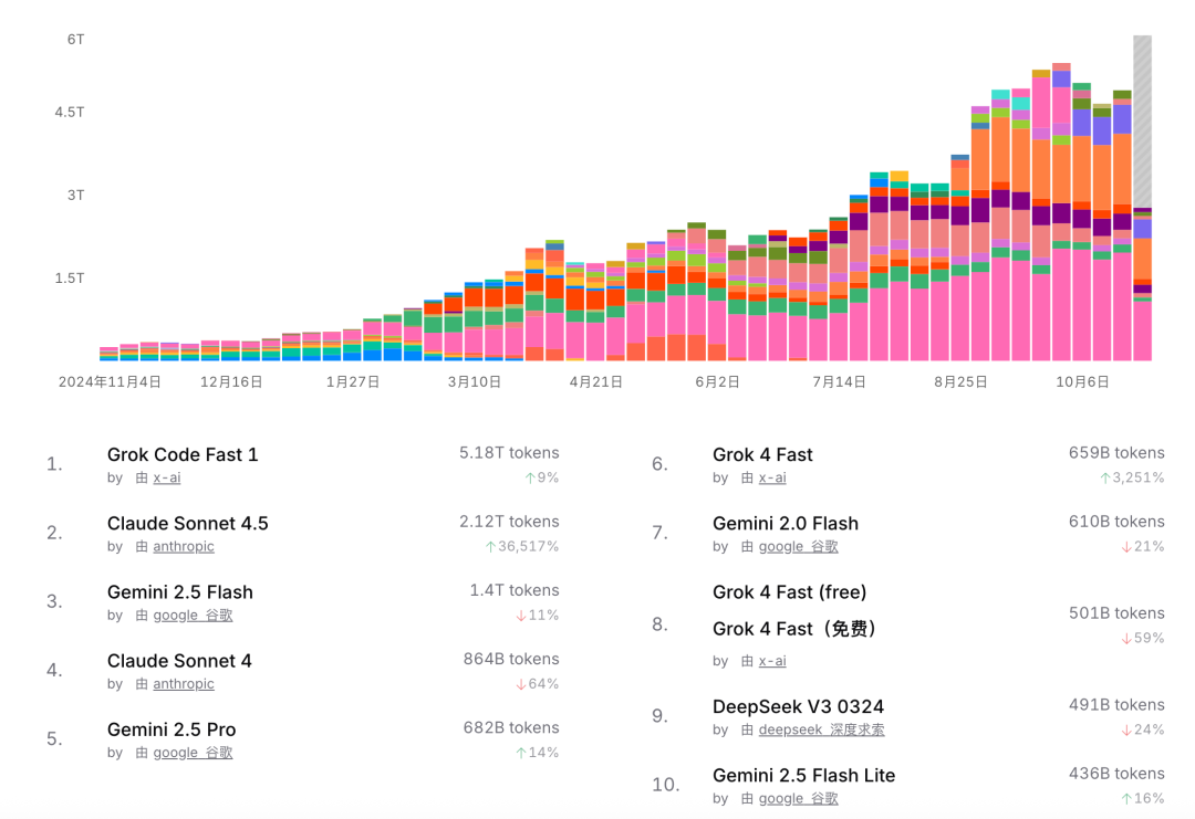 API调用方面,根据OpenRouter的最新数据显示,Grok Code Fast 1优异表现,高居榜首。
