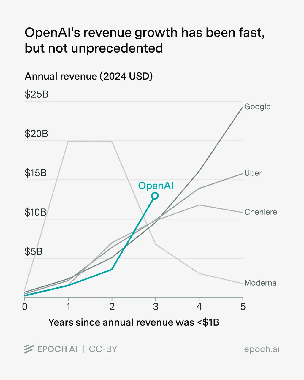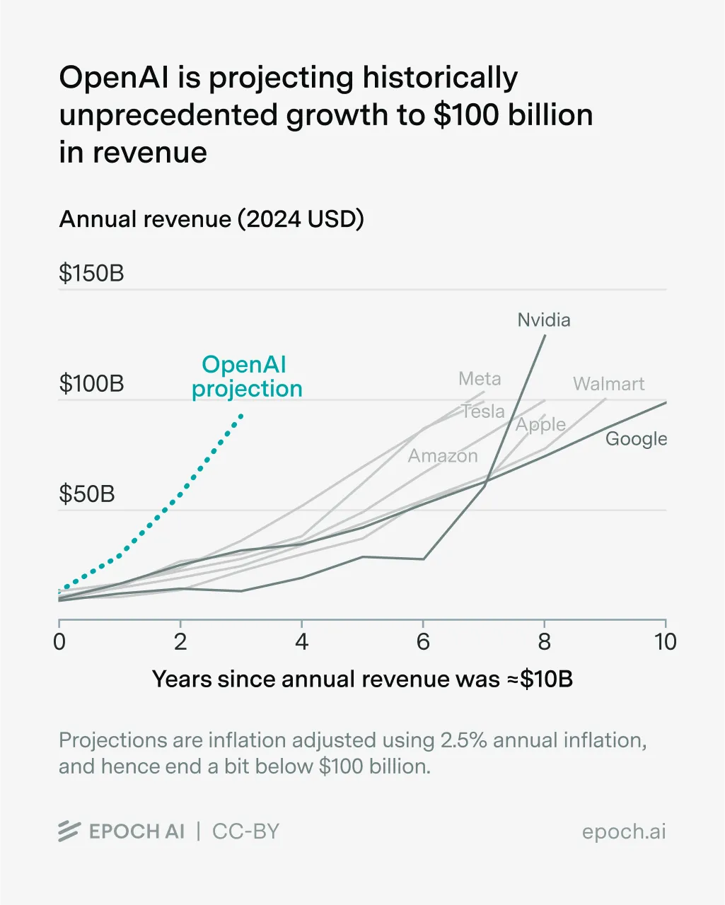 据Epoch AI的统计,在过去的50年中,只有4家美国公司能在3年内将收入从不到10亿美元增长到超过100亿美元。