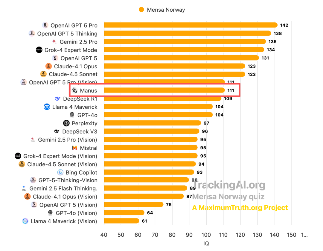 其中,GPT-5-Thingking的智商高达142,简直是天才。