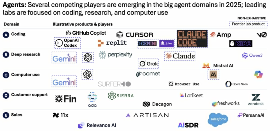 2025年,包括编程、研究和计算机应用在内的多个智能体应用场景已得到验证。人工智能实验室正逐渐向应用层深化其业务布局,并在各个应用领域与领先的初创公司展开竞争。