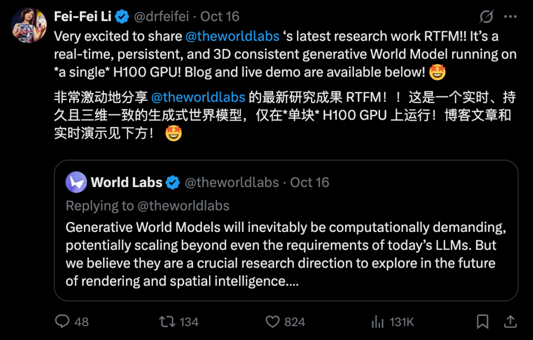 10月16日,李飞飞的World Labs发布了他们最新的研究成果全新实时生成式世界模型——RTFM(Real-Time Frame Model,实时帧模型)。