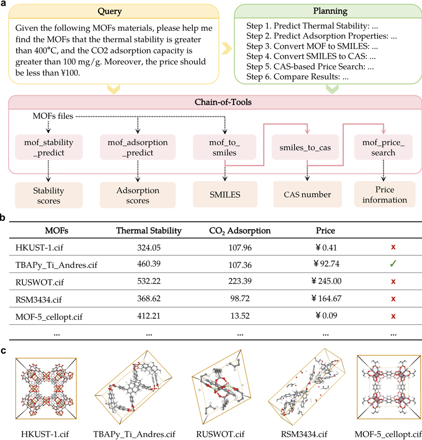 SciToolAgent能够自动整合一系列专业工具,实现MOF材料的高效筛选与分析。具体流程包括:利用模型预测材料的热稳定性(mof_stability_predict),借助RASPA2软件评估CO₂吸附能力(mof_adsorption_predict),并结合分子结构转换(mof_to_smiles, smiles_to_cas)和数据库检索工具(mof_price_search),自动获取材料的市场价格。通过这一自动化流程,系统能够根据用户设定的性能和价格标准,快速筛选出最优MOF候选材料。