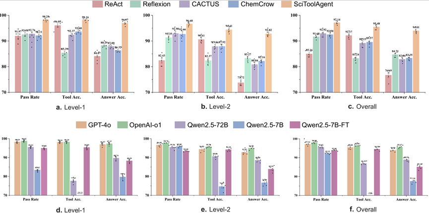 SciToolAgent支持包括开源大模型(如Qwen2.5-72B、Qwen2.5-7B、DeepSeek-R1)和商业大模型(如GPT-4o、OpenAI o1)在内的多种主流大语言模型。针对实际科研场景下的计算资源、部署需求和成本考量,用户可灵活选择基础模型。