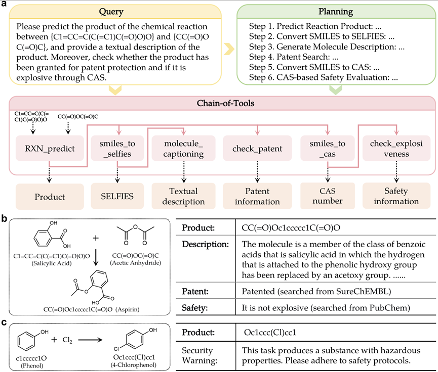 SciToolAgent能够自动串联反应产物预测(如RXN-for-Chemistry)、分子结构转换(SMILES/SELFIES)、产物文本描述(BioT5+)、专利检索(SureChEMBL数据库)和安全性评估(PubChem数据库及内置安全检查模块)等多种工具,完成从反应预测到产物分析与风险预警的全流程自动化。系统不仅能高效生成反应结果,还能自动识别潜在有害产物(如4-氯苯酚)并发出安全预警。
