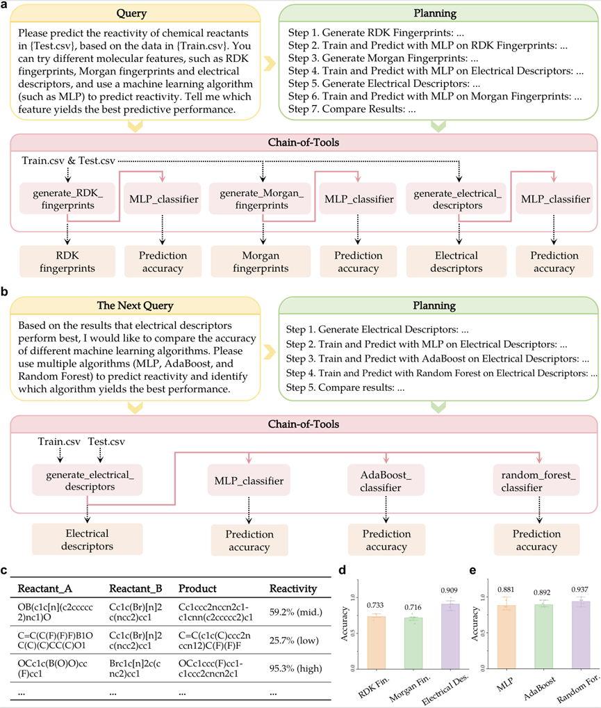 SciToolAgent通过自动集成分子指纹、电学描述符等多种分子特征(generate_RDK_fingerprints...),并结合不同机器学习算法(MLP_classifier, AdaBoost_classifier..),能够高效预测化学反应。实验结果显示,SciToolAgent不仅能够筛选出最佳特征和最优算法(如随机森林),还大幅提升了反应活性预测的准确性和自动化程度,显著优于传统智能体方法。