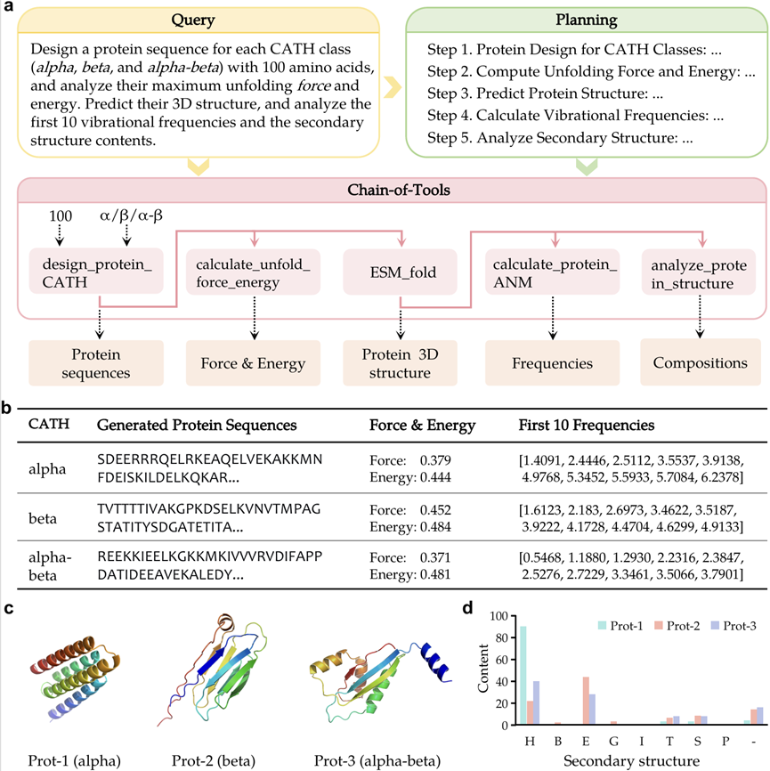 SciToolAgent自动生成的工具链包括:蛋白序列生成(design_protein_CATH)、结构预测(ESM_fold)、力学与动态稳定性分析(calculate_unfold_force_energy ...)等关键环节,无需人工干预,实现高效、全流程的蛋白设计与分析。