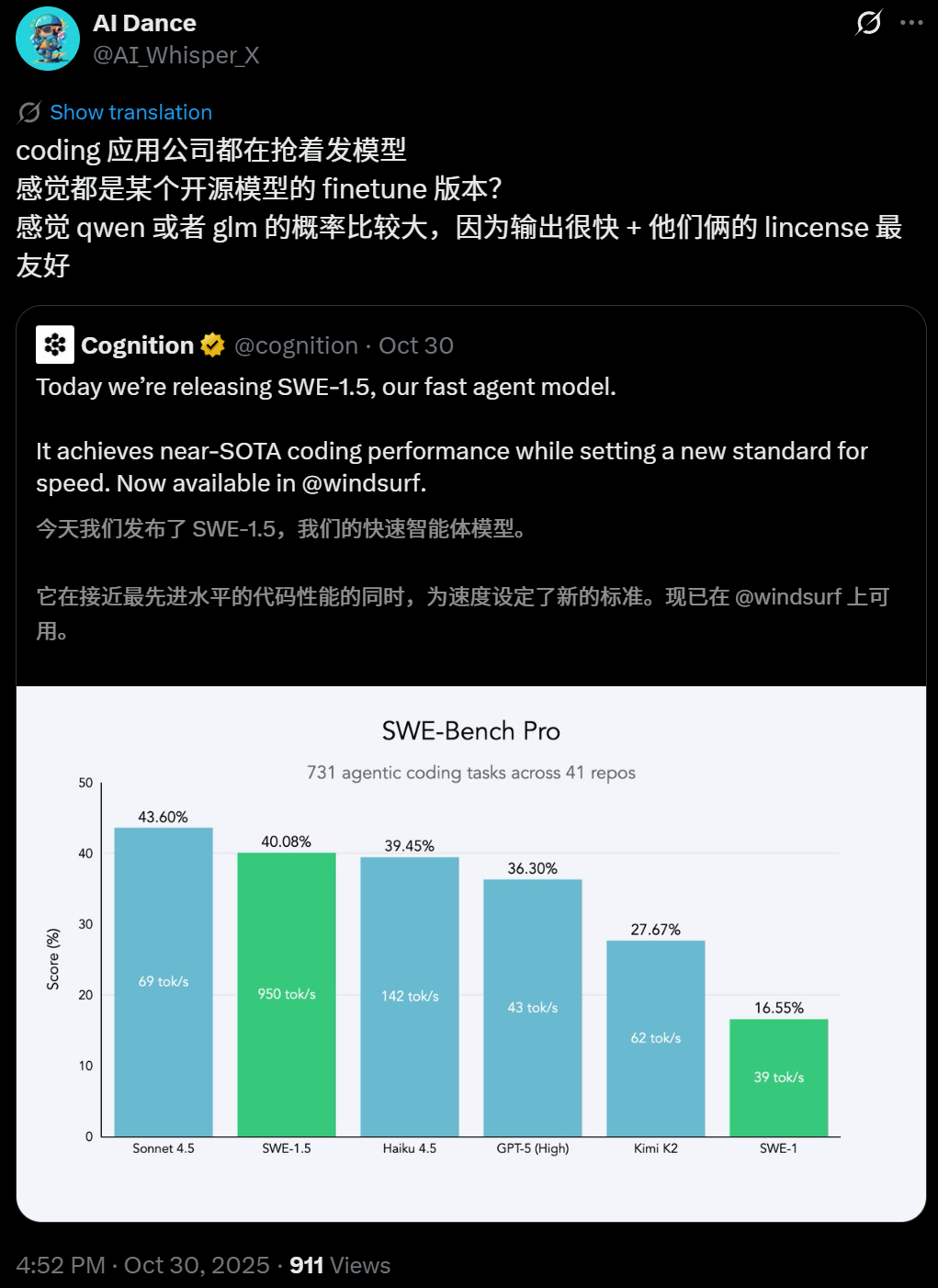 最有意思的是Windsurf,直接承认自己拿着GLM-4.6的定制版本进行微调和强化学习。