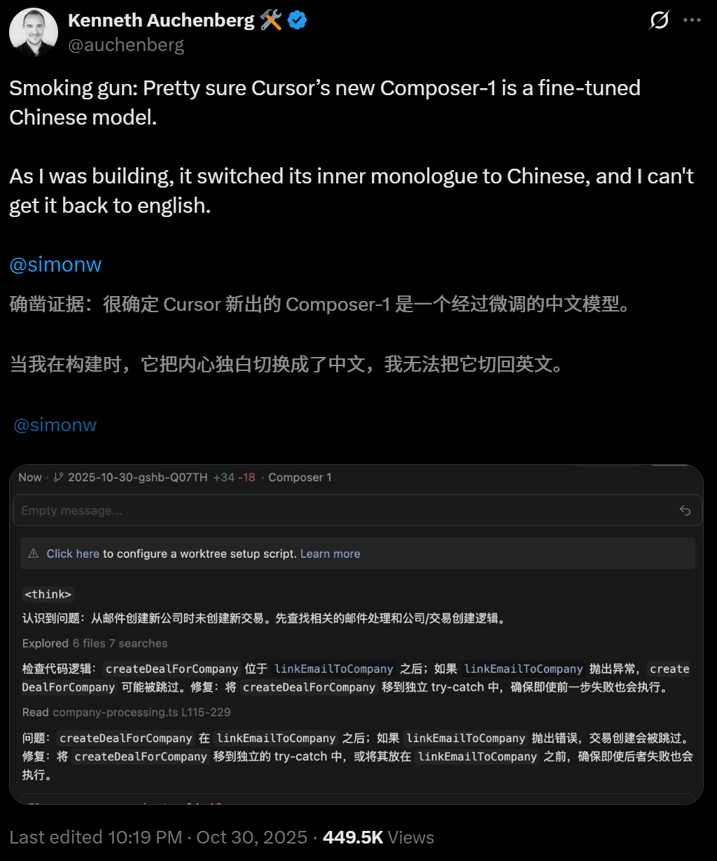 以Cursor的资源体量,从零预训练一套强模型的可能性很小,更像是在开源的SOTA智能体模型上做二次训练;因此出现「说中文」的情况并不奇怪,这更像底座与训练数据选择的结果。
