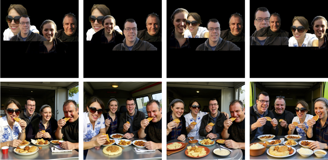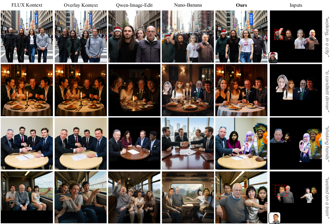 在四人同框的任务中,LayerComposer的生成质量显著优于 FLUX Kontext、Qwen-Image-Edit、Gemini 2.5 Flash Image等模型,能在存在遮挡的情况下保持人物结构完整,并忠实地还原每个人物。