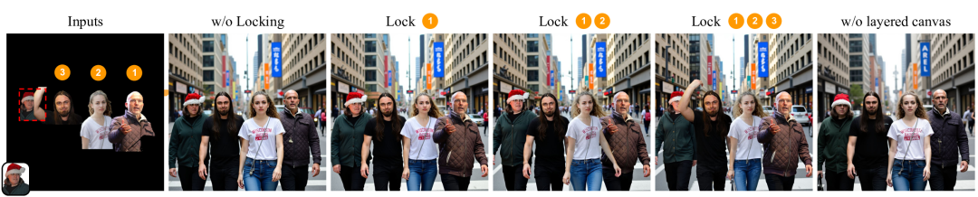 另外,在实验设置中,未锁定的层会根据已锁定的内容和整体场景上下文灵活调整,从而实现自然的协调与融合。