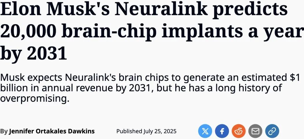 据报道,Neuralink的目标是,到2031年实现每年植入2万人,并实现年营收突破10亿美元。