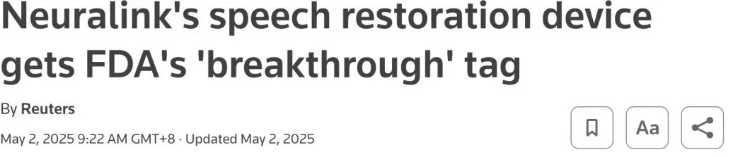 今年5月,Neuralink还获得了美国FDA授予的「突破性设备」资格,适用于言语与语言恢复方向。