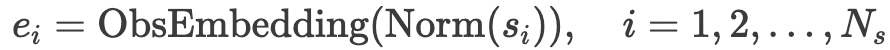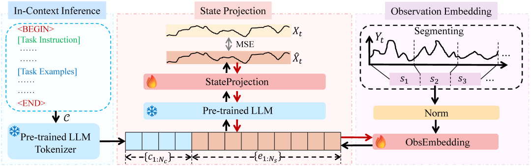 表示向下取整。如果T不能被L整除,则在末尾进行padding,以保证分段长度一致。为了充分利用LLM的预训练知识及其token转换特性,冻结其参数,并去掉原本针对语言token的嵌入和投影层。取而代之的是引入观测嵌入层:
