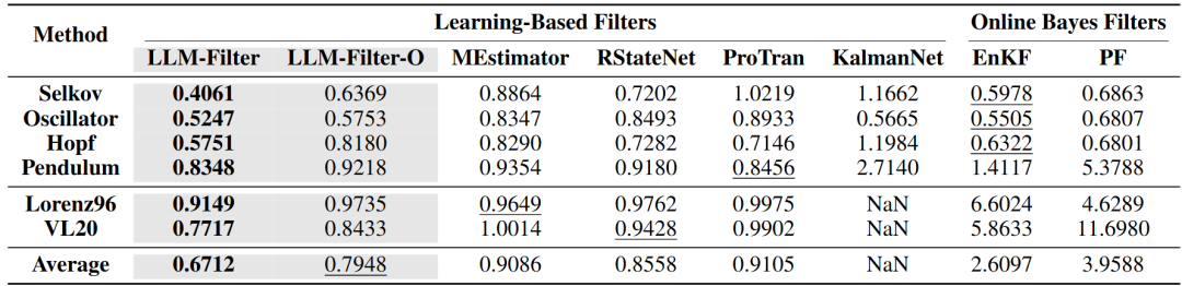 研究人员在五个经典系统上评估LLM-Filter的基本姿态估计能力,包含四个非线性系统(Selkov,Oscillator,Hopf, Pendulum)和两个高维混沌系统(Lorenz96和VL20)。并与现有在线滤波和学习型滤波方法进行对比估计误差(RMSE)。