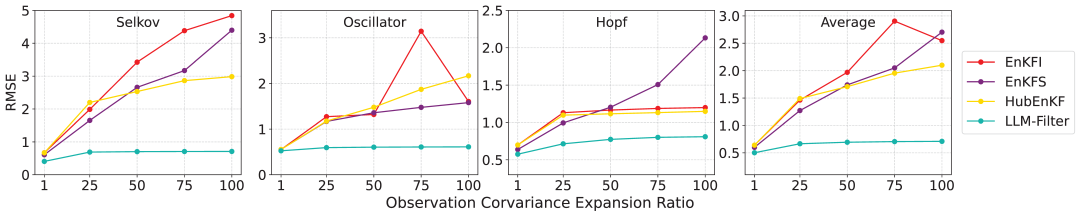 研究人员在Selkov、Oscillator和Hopf系统上测试了LLM-Filter的模型失配情景,量化指标为观测协方差扩展比(OCER)。