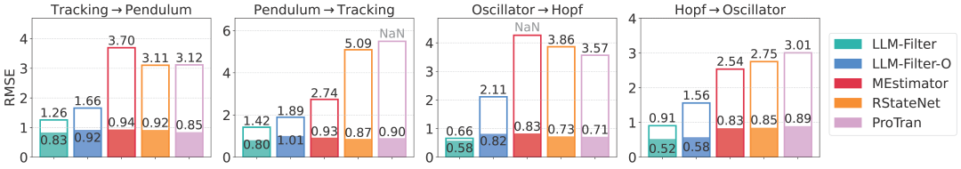 在此实验中,研究人员评估了完全不同系统的泛化性能。 具体而言,对于LLM-Filter以及学习型滤波器KalmanNet、MEstimator、RStateNet和ProTran,研究人员在一个系统上训练,并在另一个系统上测试性能。
