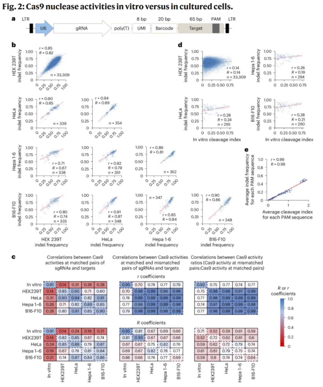 为了比较体外切割效率与细胞内 indel 频率的关系,研究人员构建了使用 U6 启动子的文库(U6_120k),并在多种细胞系(HEK293T、HeLa、Hepa 1–6、B16-F10)中测定。结果显示不同细胞间的 indel 频率高度相关,但体外切割指数与细胞内 indel 频率的相关性较低(r ≈ 0.27),而 PAM 相容性在体外与细胞中则几乎一致(r ≈ 0.99)。这表明 indel 频率受细胞环境影响较大,而 PAM 识别规律具有普适性。