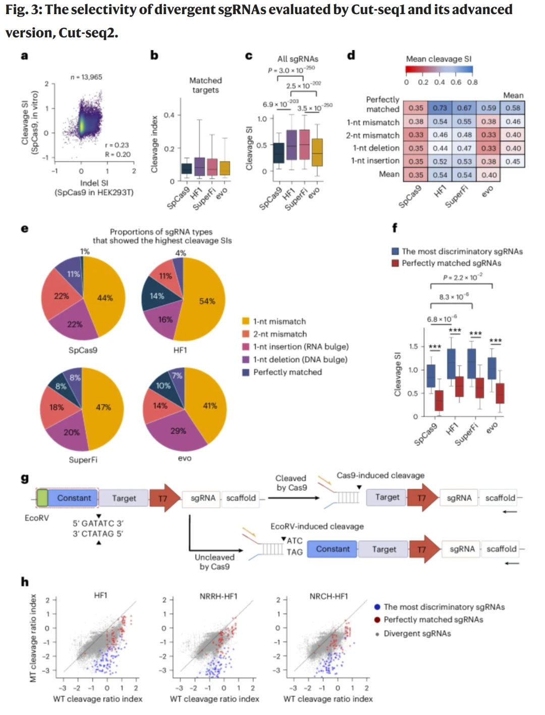 研究人员构建了包含 30,772 对 sgRNA–靶序列的 Cut1_30k 文库,用以评估不同 Cas9 变体(SpCas9、HF1、SuperFi、evoCas9)及其在 1-bp 差异序列下的切割选择性。结果显示,高保真变体 HF1 与 SuperFi 具有更优的选择性指数(SI),且多数最佳区分 sgRNA 并非完全匹配,而是带有单碱基错配的“差异型 sgRNA”。基于此,研究人员改进为 Cut-seq2,可同时检测被切割与未切割序列,以切割比值指数更准确反映活性。
