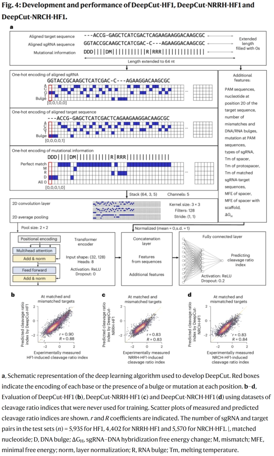 利用 Cut-seq2 生成的 18 万余组 sgRNA–靶序列数据,研究人员开发了基于 Transformer 与卷积网络架构的 DeepCut-HF1、DeepCut-NRRH-HF1 与 DeepCut-NRCH-HF1 模型,用以预测切割比值指数。模型采用 sgRNA–靶序列配对编码及突变信息输入,显著优于传统机器学习方法,相关性高达 r = 0.90。