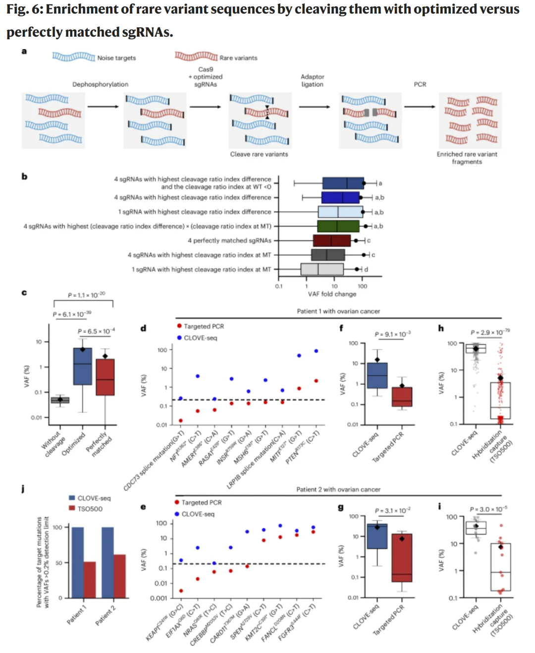研究人员利用 DeepCut 选取针对 2,612 个癌症突变的优化 sgRNA,构建了 optimized_HF1_2k 与 optimized_NRRH_2k 文库。通过多轮 Cas9 切割与 PCR 扩增(CLOVE-seq),研究人员在 7.8k 稀有变体文库中实现了高达 900 倍的平均等位基因频率提升,且超过 80% 的突变可被检测。相比之下,使用完全匹配 sgRNA 的富集效率明显较低。
