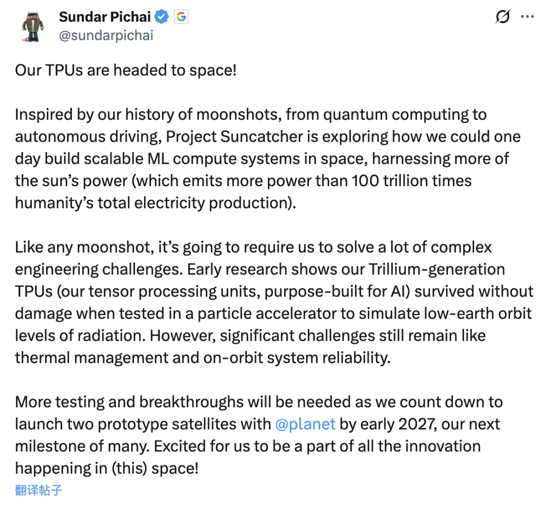 CEO劈柴哥表示要把TPU也发射上去,最早的两颗卫星2027初启程。
