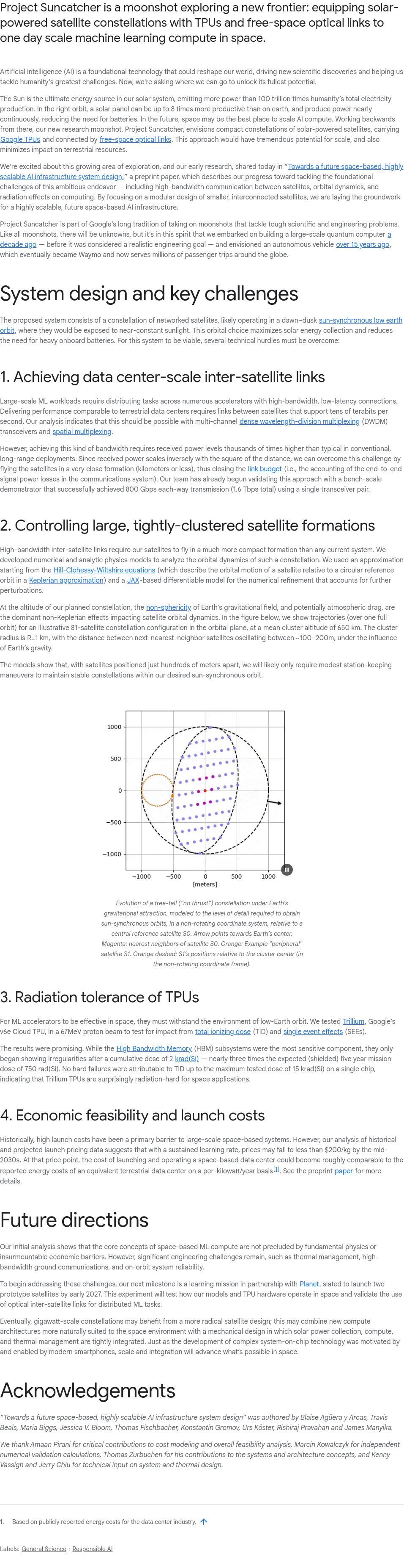 Project Suncatcher 是谷歌探索在太空中扩展人工智能计算能力的前沿项目。该项目设想部署由太阳能驱动的卫星星座,配备谷歌TPU(张量处理单元)和自由空间光通信链路,利用太空充足的太阳能源高效运行机器学习任务。相比地面,特定轨道上的太阳能板发电效率可提升近8倍,且能持续供电,减少对储能依赖。太阳释放的能量远超人类总电力需求,太空或成未来AI算力扩展的理想场所。通过反向推导,Project Suncatcher 致力于构建紧凑、互联的智能卫星网络,推动AI与航天技术融合,开启太空计算新纪元。