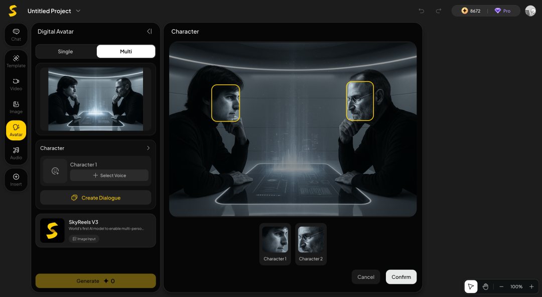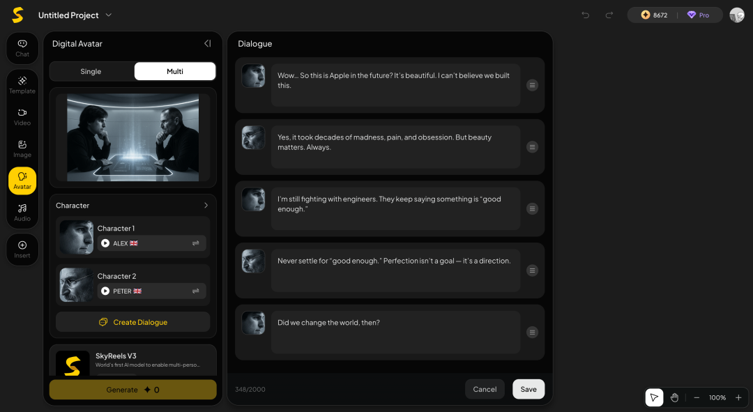 通过头像、对话提示词和配音三管齐下,SkyReels可以精确控制每个角色的说话时机与节奏,让多角色互动自然流畅,具备真实的对话感。