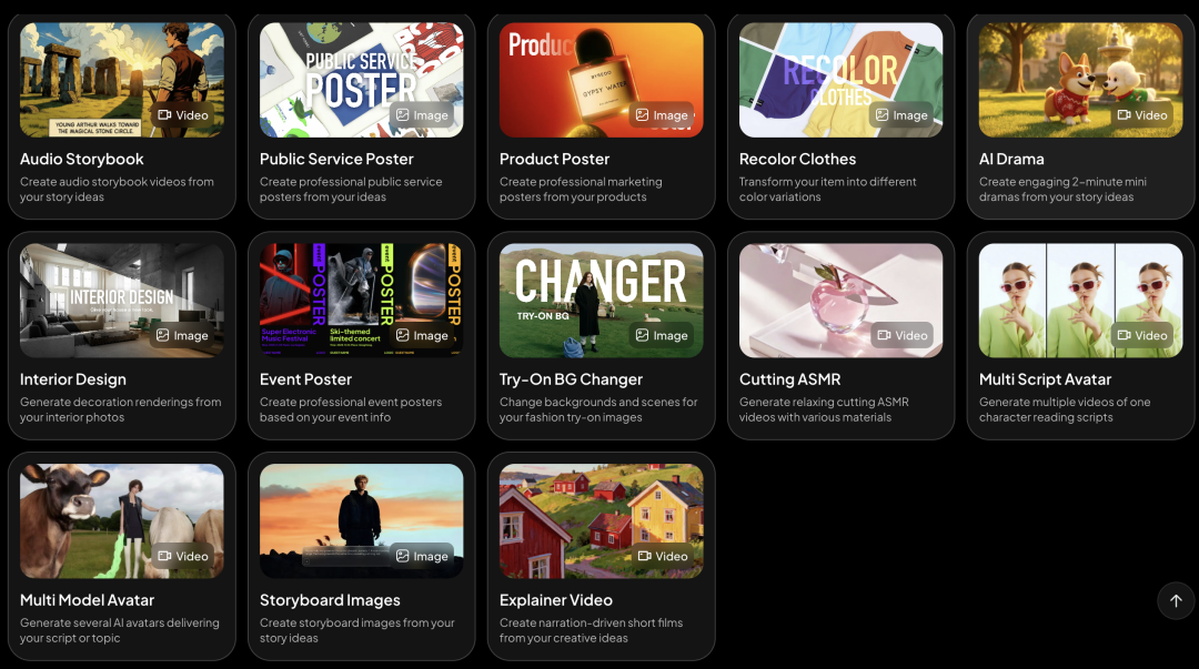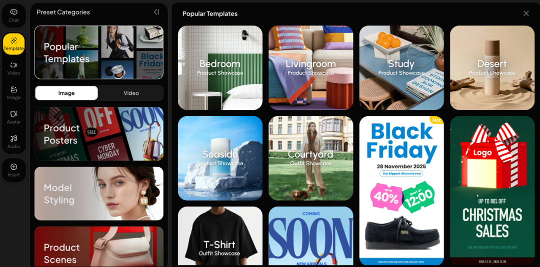 针对功能海报设计、电商服装图制作、商品演示视频以及数字人口播讲解等主流应用场景,SkyReels模板库提供了近10个大类、150余种模板,支持图片与视频的快速生成。