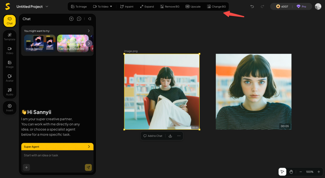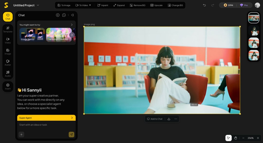 无限画布让我们无需开启多个对话打断思路,而且点击图片和视频结果时,顶部都会出现不同的快捷功能栏。