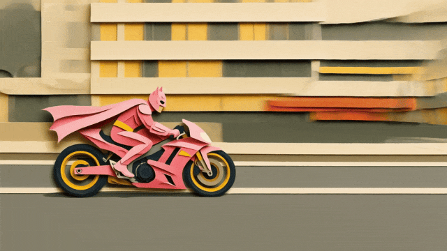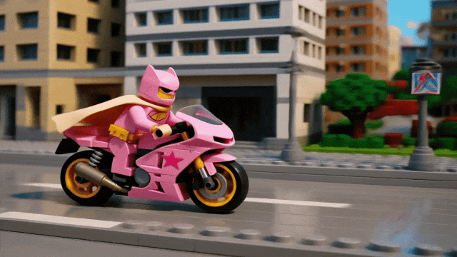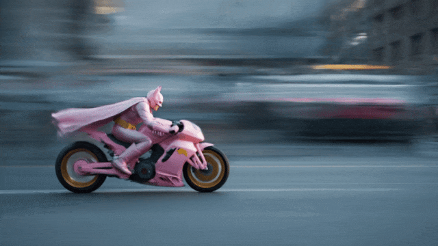 比如先制作一个身穿粉色披风的蝙蝠侠骑机车的镜头。