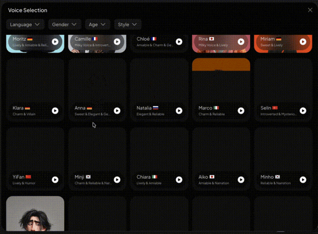 还可以选择性别、年龄和语言风格,比如: