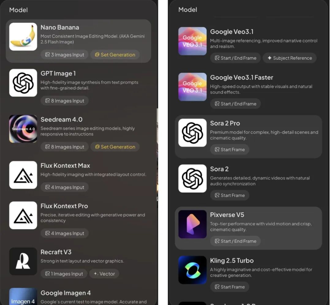 值得一提的是,在全新的SkyReels上,集成了全球顶尖的AI模型,比如在文生图上就可以调用谷歌最新的Nano Banana模型。