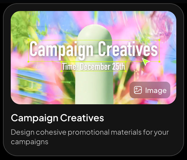比如,新店开业,需要一套宣传物料,直接使用「创意活动」(Campaign Creatives),即可快速设计营销活动宣传材料。