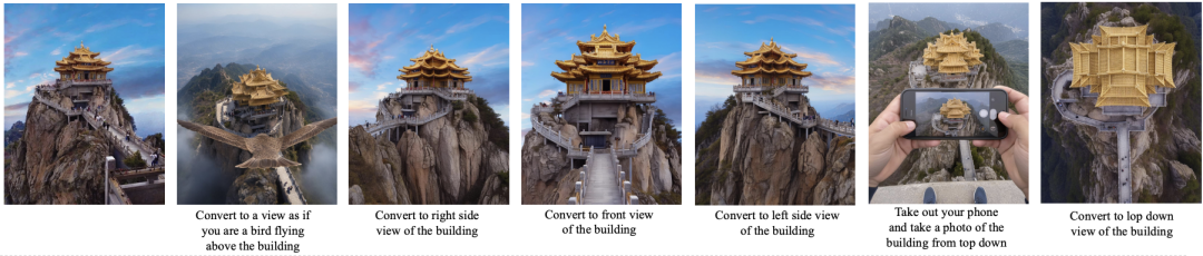 给定一张建筑正面图,指令「切换到俯视图」,模型能像拥有3D建模能力一样,合理地生成新视角。